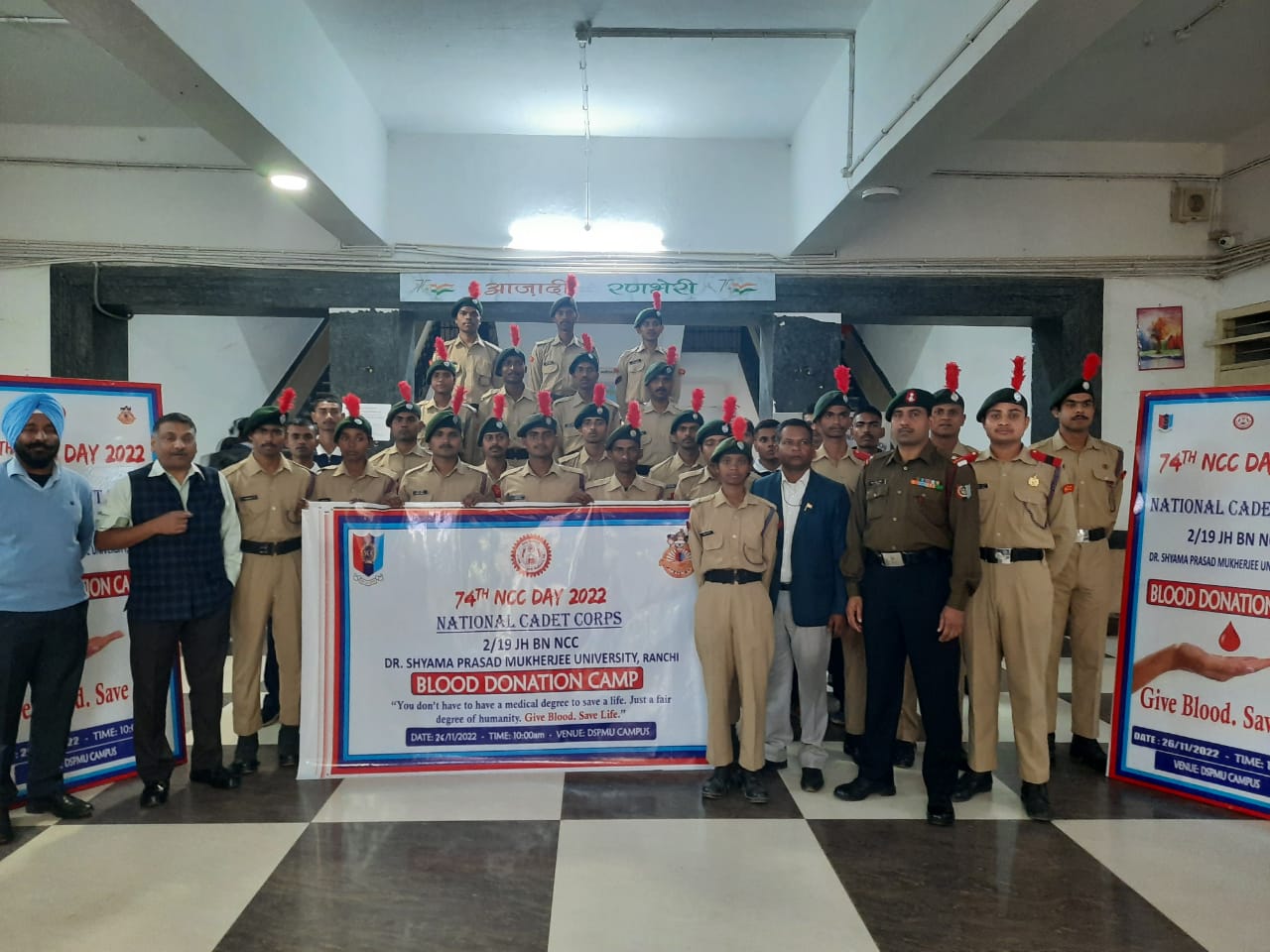 19 झारखंड बटालियन एनसीसी रांची के सौजन्य से एनसीसी दिवस के मौके पर विश्वविद्यालयों और महाविद्यालयों के एनसीसी इकाई डॉ श्यामा प्रसाद मुखर्जी विश्वविद्यालय एवं साईंनाथ विश्वविद्यालय ओरमांझी द्वारा रक्तदान शिविर का आयोजन किया गया। जिसमें उपरोक्त विश्वविद्यालय एवं महाविद्यालय के 150 एनसीसी कैडेटों ने भाग लिया। शिविर में 60 कैडेटों ने रक्तदान किया।शिविर को […]