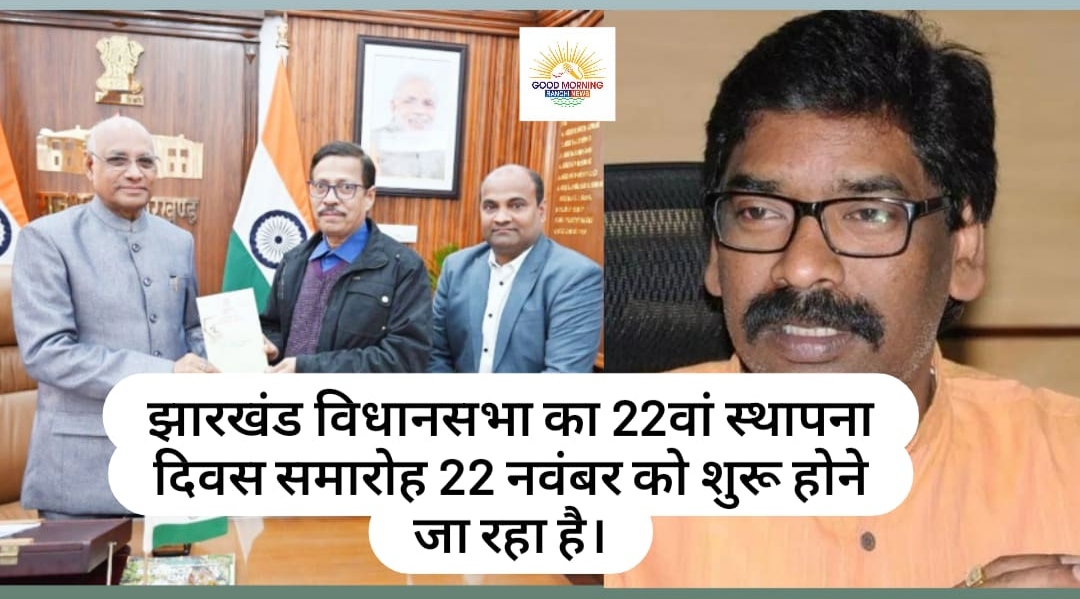 झारखंड विधानसभा का 22वां स्थापना दिवस समारोह 22 नवंबर को शुरू होने जा रहा है। 22 नवंबर को यानि कल मंगलवार को राज्यपाल रमेश बैस समारोह का उद्घाटन करेंगे। सीएम हेमंत सोरेन मुख्य अतिथि होंगे। देश की सीमा पर और नक्सली हिंसा में शहीद हुए राज्य के जवानों के आश्रित परिवार को समारोह के पहले दिन में सम्मानित किया जाएगा। समारोह में झारखण्ड के इस वर्ष के 10वीं और 12वीं के टॉपर्स स्टूडेंट्स को भी सम्मानित किया जाएगा। साथ ही समारोह में विधानसभा की त्रैमासिक पत्रिका उड़ान का लोकार्पण और स्पीकर रबींद्रनाथ महताे द्वारा लिखित पुस्तक संसदीय दायित्व के तीन साल का भी लोकार्पण किया जाएगा।प्रभारी सचिव झारखंड विधान सभा सैयद जावेद हैदर ने मुख्यमंत्री हेमंत सोरेन एवं राज्यपाल रमेश बैस से मुलाकात कर राज्यपाल और मुख्यमंत्री को उन्होंने 22 नवंबर 2022 को आयोजित झारखंड विधान सभा स्थापना दिवस समारोह एवं 23 नवंबर 2022 को आयोजित सांस्कृतिक कार्यक्रम में शामिल होने के लिए आमंत्रित किया।
