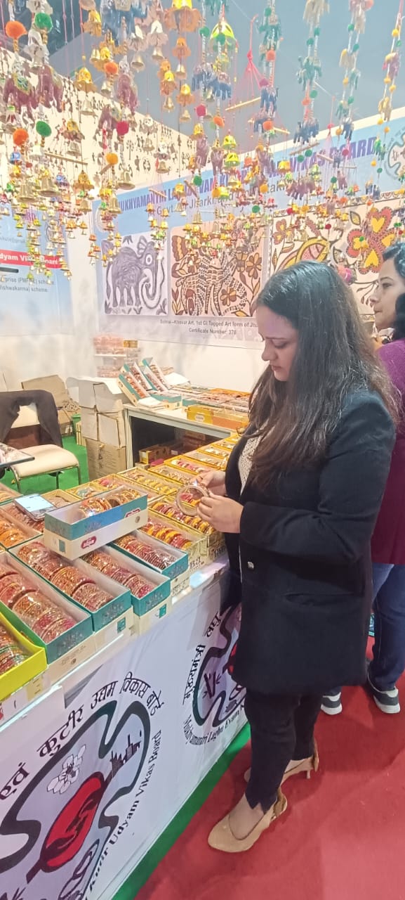 ज्ञात हो कि झारखंड राज्य देश में लाह का प्रमुख उत्पादक है। ऐसे में पवेलियन में लाह की बनी वस्तुओं की भी बिक्री की जा रही है। ऐसी ही एक स्टॉल पर लाइट और साउंड लगी चूड़ी और कड़ा लोगों के आकर्षण का केंद्र बनी हुई है। लाह हस्तशिल्प स्वावलंबी सहकारी समिति के झाबरमल बताते है कि लाह के उत्पादों को बनाने और उसकी बिक्री का काम उनके पूर्वजों द्वारा भी किया जा रहा था। जैसे जैसे ट्रेंड बदलता है वो अपने उत्पादों में भी बदलाव करते रहते है। इस वर्ष मेले में वो लाइट लगी चार्जेबल ब्लू टूथ से कनेक्ट होने वाली चूड़ियां लेकर आए है। इसकी कीमत 1000 रुपए है। जिसकी मांग मेले में बहुत हो रही है। इसके साथ साथ इनके पास लाह से बनी अन्य चूड़ियां, डेकोरेटिव सामान आदि भी उपलब्ध है।