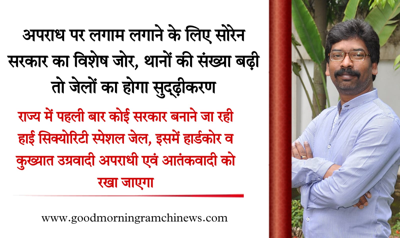 राज्य में बढ़ते अपराध पर रोक लगाने के लिए बीते जून माह को मुख्यमंत्री हेमंत सोरेन ने एक उच्चस्तरीय बैठक की थी। बैठक में सरकार के बड़े अधिकारी सहित तमाम आला पुलिस अधिकारी उपस्थित थे। सीएम ने कहा था कि अपराध के चेहरे हर दिन बदल रहे हैं। नई चुनौतियां आपके सामने आ रही है। इतना ही नहीं भविष्य में भी कई नई चुनौतियां आएंगी। इससे निपटने की रणनीति के तहत अभी से एक्शन प्लान बनाने में जुट जाएं। इस प्लान को धरातल पर उतारने के लिए बीते दिनों कैबिनेट बैठक में एक अहम फैसले लिया गया है। फैसला कई जिलों में नए पुलिस थाना गठन को लेकर है। राज्य के जेलों के सुदृढीकरण पर सरकार विशेष काम कर रही है। इसके अलावा पुलिस कर्मियों के कल्याणकारी उपायों पर भी राज्य सरकार का विशेष जोर हैं।