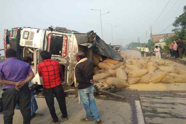 तोपचांची थाना क्षेत्र अंतर्गत कोटालड्डा एनएच पर गेहूं लदा ट्रक अनियंत्रित होकर ओवरब्रिज से करीब 10 फीट नीचे सर्विस रोड पर जा पलटा. इस हादसे में ट्रक चालक व उपचालक बाल-बाल बच गये. दोनों को हल्की चोट आयी है. ट्रक पलटने से उसमें लदी गेहूं की बोरियां सड़क पर बिखर गयी. जिसकी वजह से सर्विस रोड पर आवागमन बाधित हो गया. इस घटना में ट्रक बुरी तरह से क्षतिग्रस्त हो गया. घटना के बाद आस-पास के ग्रामीणों की भीड़ जुट गयी. सूचना पाकर तोपचांची पुलिस भी घटनास्थल पर पहुंचकर जांच पड़ताल में जुट गयी है.